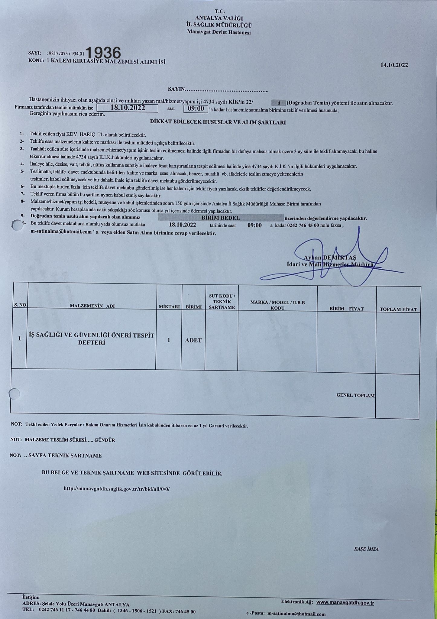 | İhale Adı | : | 1 KALEM İŞ GÜVENLİĞİ ÖNERİ TESPİT DEFTERİ ALIMI |