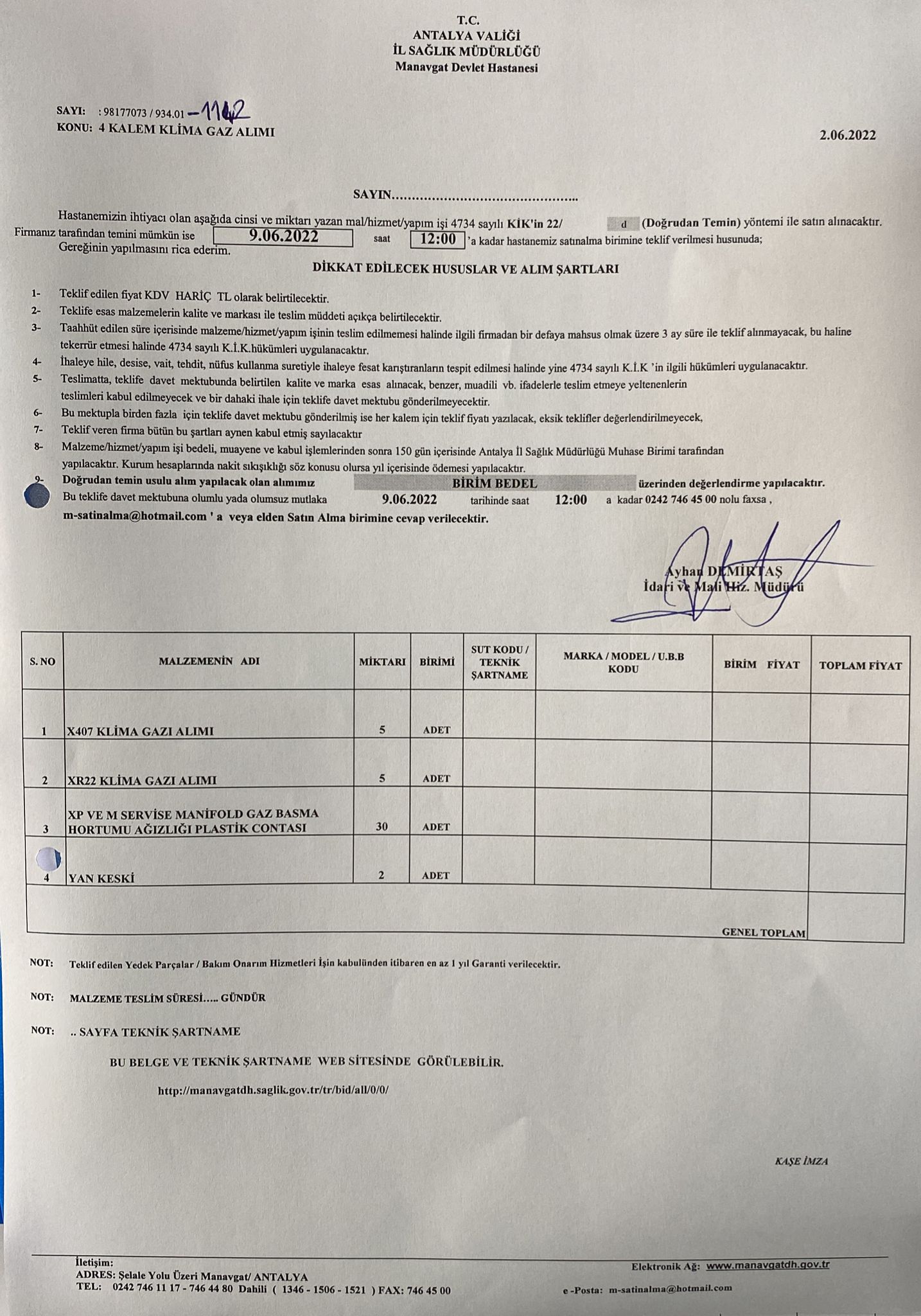 | İhale Adı | : | 4 KALEM KLİMA GAZI ALIMI İŞİ |
